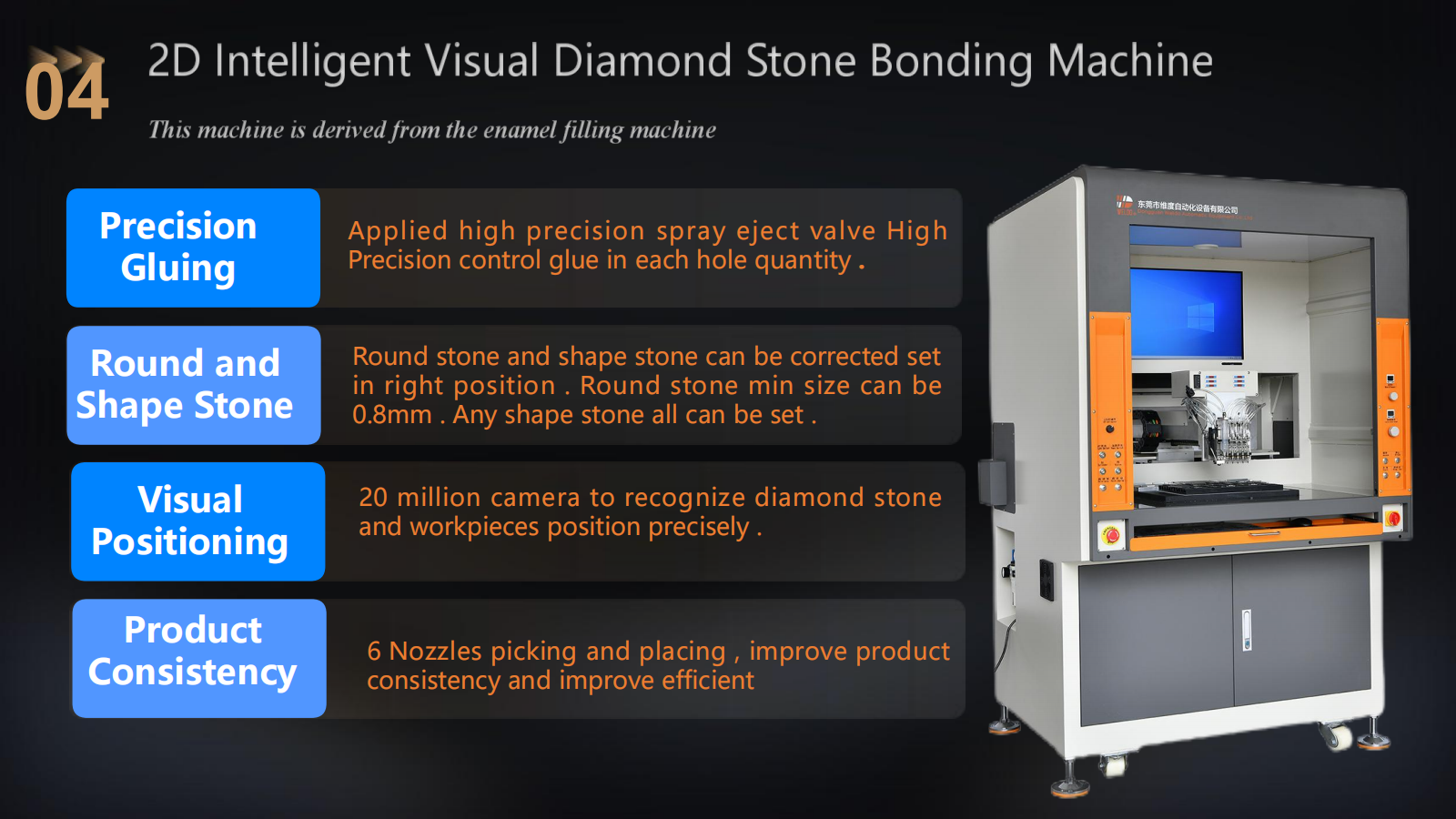 The Intelligent Visual Diamond Stone Bonding Machine is a high-precision automated solution designed to set up to six different sizes and multicolor diamond stones on various items such as ear studs, pendants, metal tags, bracelets, charms, branded fashion metal accessories for shoes and garments, and even customized automotive logos.