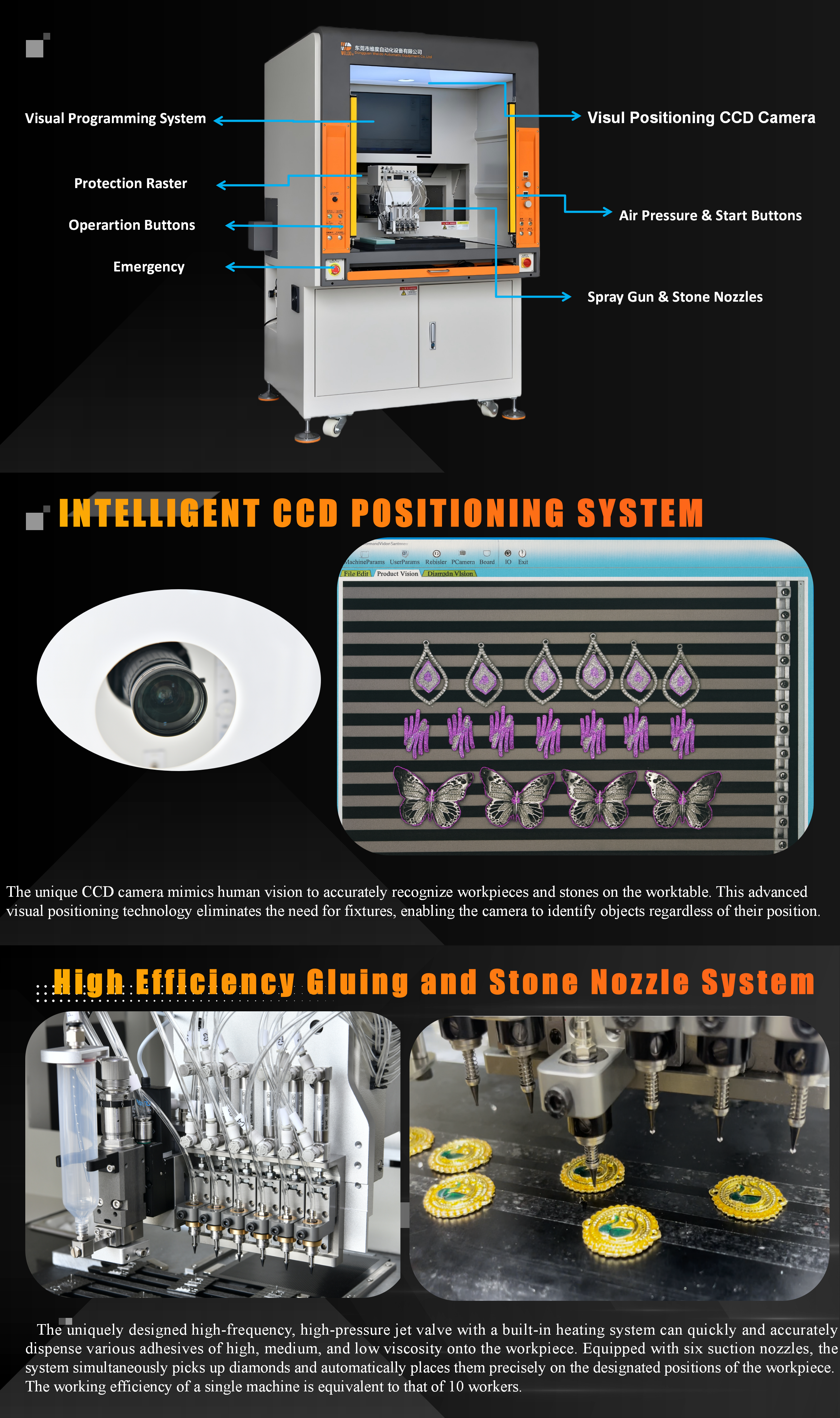 • Gluing & Stone Placement System – to dispense glue and accurately pick and place stones with rotary nozzles.